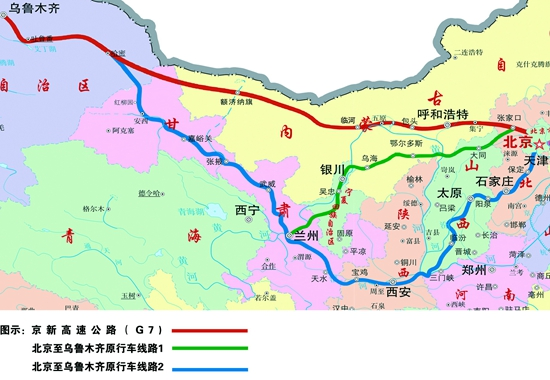 京新高速的出現,將大大縮短北通道的兩端的距離。比現有通道“北京-大同-鄂爾多斯-烏海-銀川-蘭州-哈密-烏魯木齊”運營里程縮短1136公里;比“北京-石家莊-太原-西安-蘭州-哈密-烏魯木齊”運營里程縮短1300多公里。