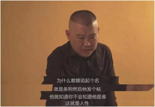 郭德綱解釋説:為什麼敢瞎説?起個名,就是條狗,然後他發個帖,他就知道你不會知道他是誰,這就是人性。