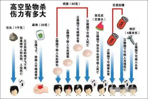 有數據表明:一個30克的雞蛋從4樓拋下來就會讓人起腫包;從8樓拋下來就可以讓人頭皮破損;從18樓拋下來就可以砸破行人的頭骨;從25樓拋下,就可使人當場死亡。