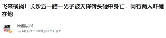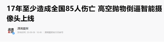 瀟湘晨報《飛來橫禍!長沙五一路一男子被天降磚頭砸中身亡,同行兩人嚇癱在地》、《17年至少造成全國85人傷亡 高空拋物倒逼智能攝像頭上線》