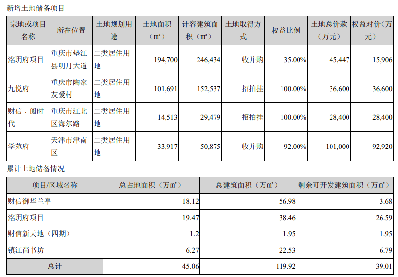 在土儲方面,這一年,財信發展一共就只有四塊地進賬,其中重慶三塊、天津一塊。