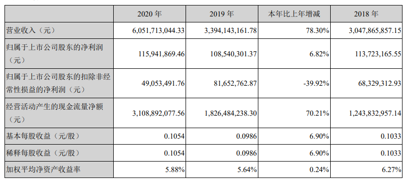 聯合開發提升了擴張效率,但卻稀釋了利潤。2020年,財信發展的營收60.52億元,同比增長78.30%,但歸屬於上市公司的淨利潤1.16億元,同比增長只有6.82%,嚴重不匹配。