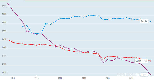 在三部法律以及日本政府的綜合治理下,日本人每年工作時長,從1988年的2092個小時,快速下降至2019年的1644個小時,低於世界平均水平。