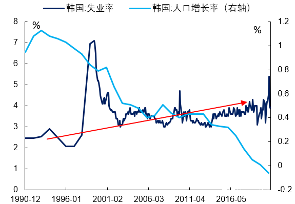 韓國,人口紅利期失業率2% ,人口衰退期失業率3.5%;