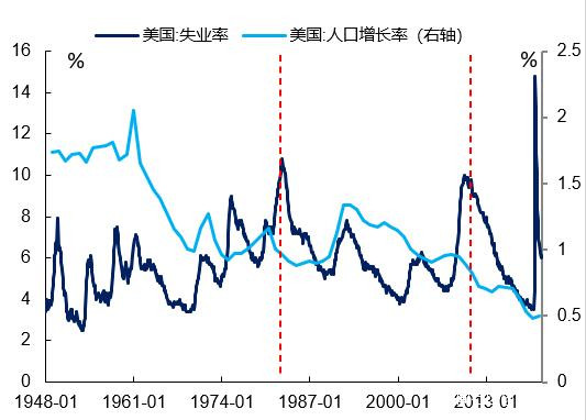 當時的美國經濟快速發展,分別被稱為美國的“黃金時代”和“新經濟時代”。即使經濟有波動,衰退和失業情況,也好於人口“低谷期”。