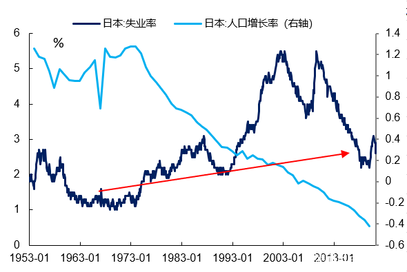 日本,人口紅利期失業率1% ,人口衰退期失業率2%;