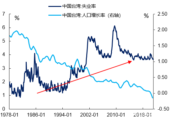和韓國比較類似,90年代初中國台灣地區人口增長較快,經濟蓬勃發展,失業率長期穩定在1.5%左右。