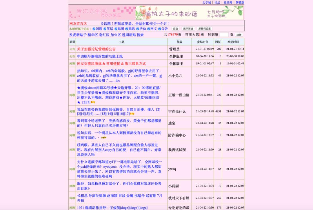 後來她知道這個論壇叫“兔區”,是晉江文學城的網友交流版塊,“小粉紅”一詞的發源地(論壇背景為粉紅色)。這裏也是飯圈粉黑大戰的主戰場之一。