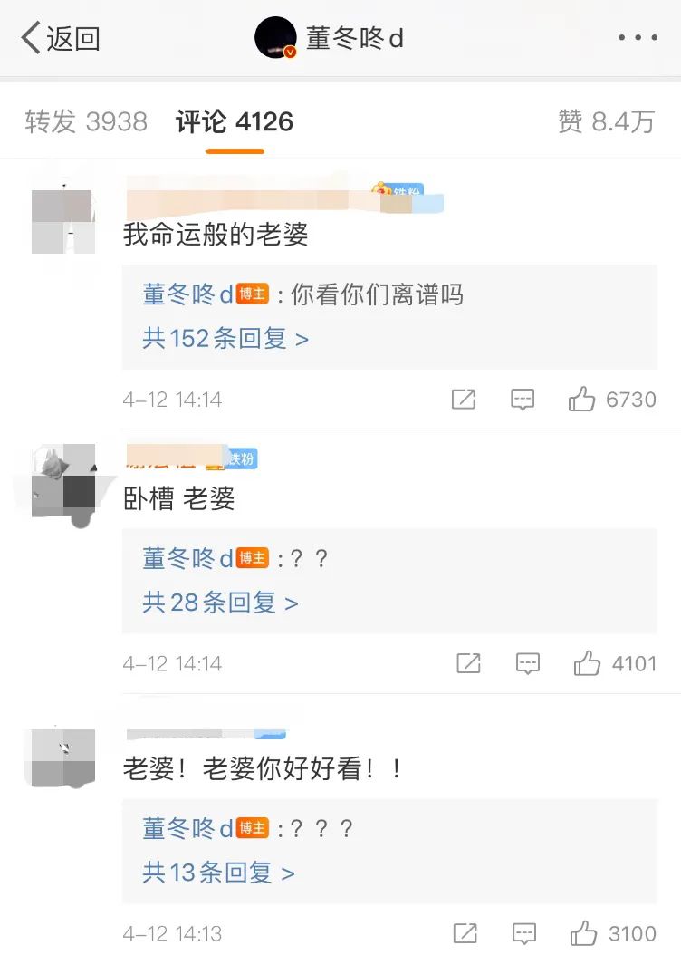 這一天有些特別,董子健注意到了那些“喊老婆的人”。他留下幾個問號,調侃道:“你看你們離譜嗎?”隨後,這次互動登上熱搜,獲得一億次圍觀。