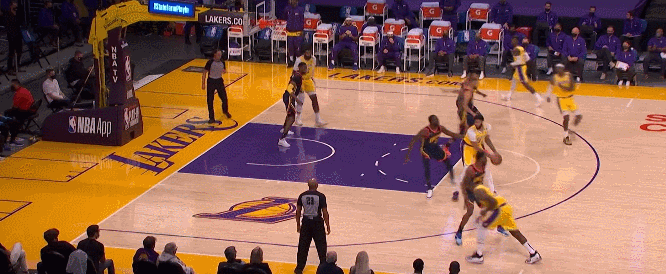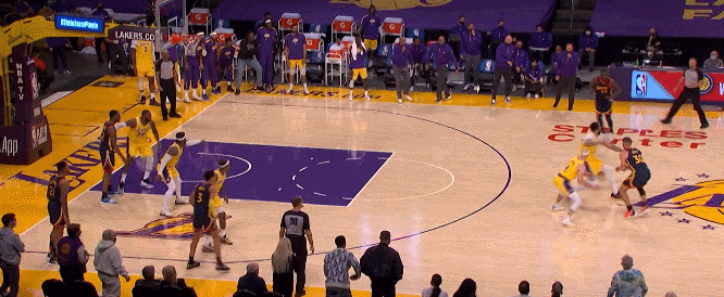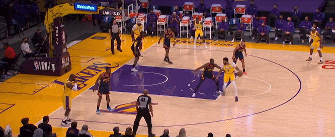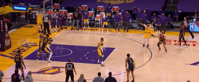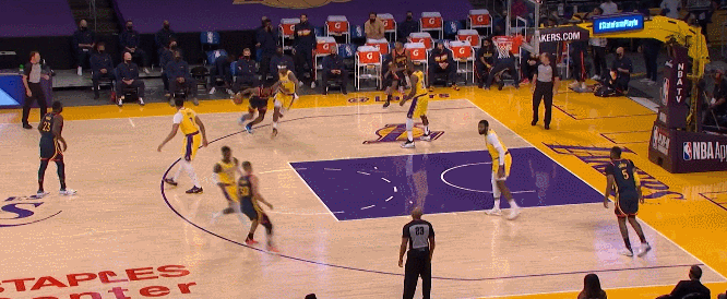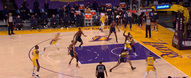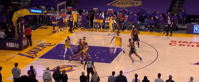 最後2.1秒那個機會,勇士暫停明顯叫慢了,但湖人也知道勇士一定會找庫裏,所以遇到所有的無球掩護全部換防,在發球的5秒時間裏,濃眉分別換防了四名勇士球員——維金斯、普爾、格林和最後借格林掩護想要出來接球的庫裏。