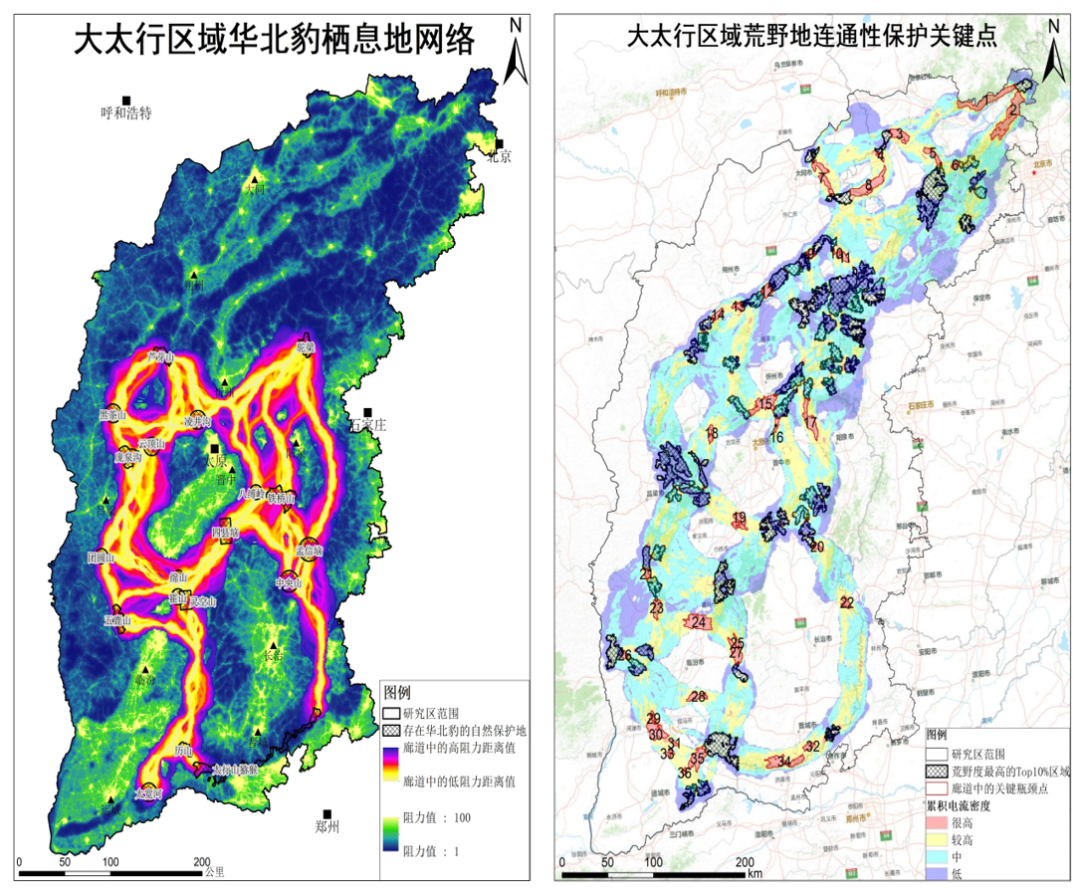 基於森林面積、與村鎮/道路的距離等變量,他在從山西和順到北京北部山區的範圍裏計算豹進行移動的阻力和可以停留的棲息地。