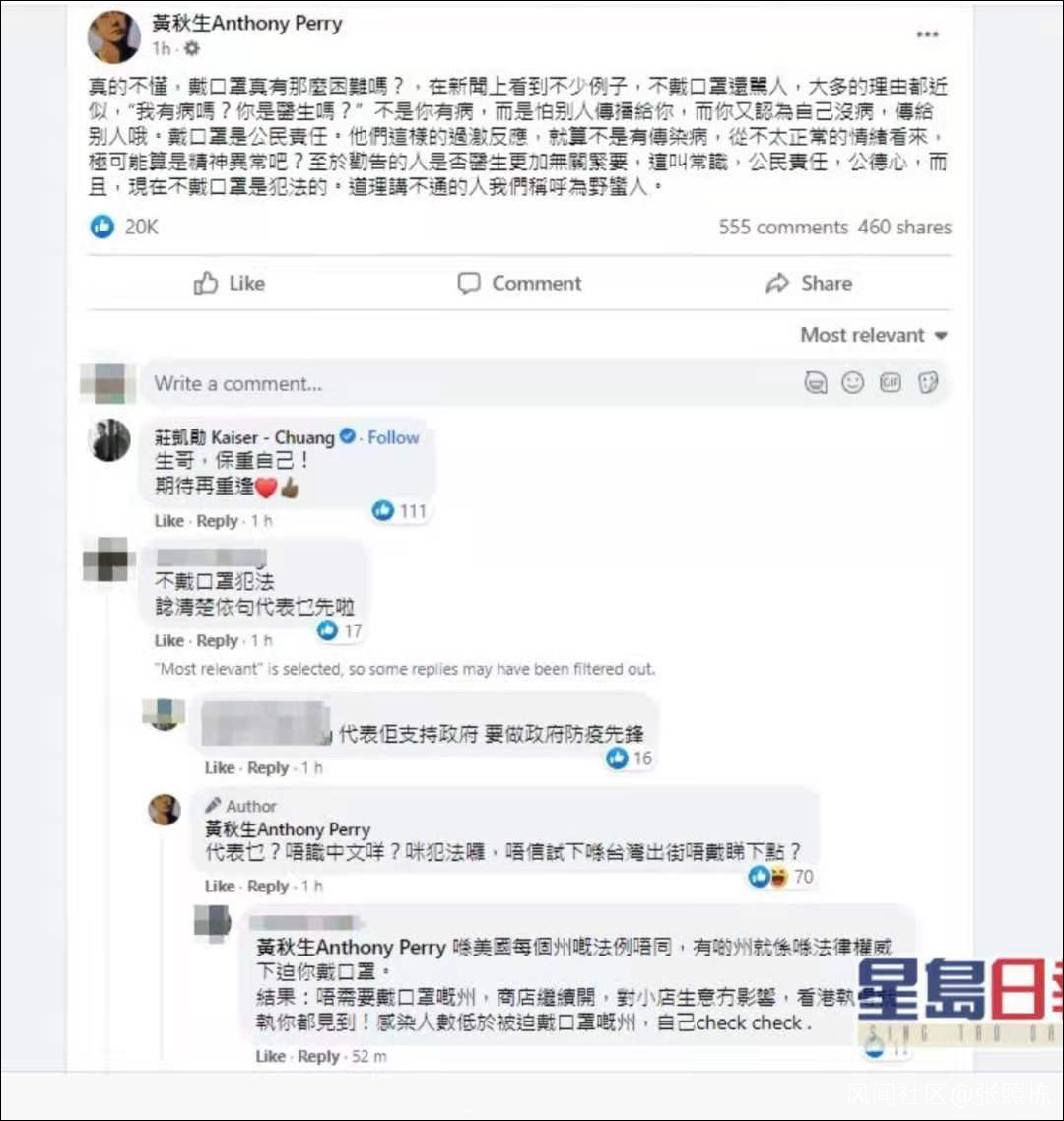不滿島內民眾不戴口罩,黃秋生:野蠻人_風聞