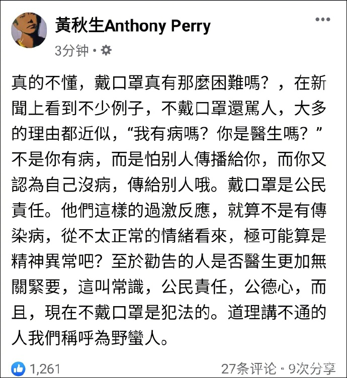 黃秋生寫道:“真的不懂,戴口罩有那麼困難嗎?在新聞上看到不少例子,不戴口罩還罵人……戴口罩是公民的責任,他們這樣的過激反應,就算不是有傳染病,從不太正常的情緒來看,極可能算是精神異常吧?”