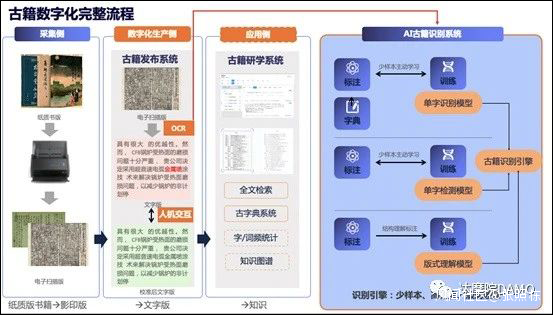 根據微信公眾號“達摩院DAMO”介紹,古籍數字化完整流程主要分為採集側、數字化生產側、和應用測三個環節。採集側主要是將紙質書變為電子掃描版,數字化生產側時間電子掃描版變為文字版,應用側則是將文字版變為古籍研學系統,涵蓋檢索、字典、知識圖譜等功能。