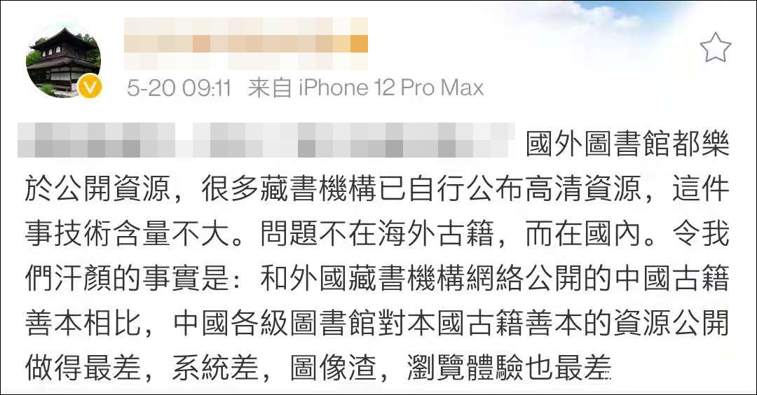 “國外很多藏書機構已自行公佈高清資源,這件事技術含量不大……中國古籍善本的資源公開做得最差、系統差、圖像渣,瀏覽體驗也最差。”
