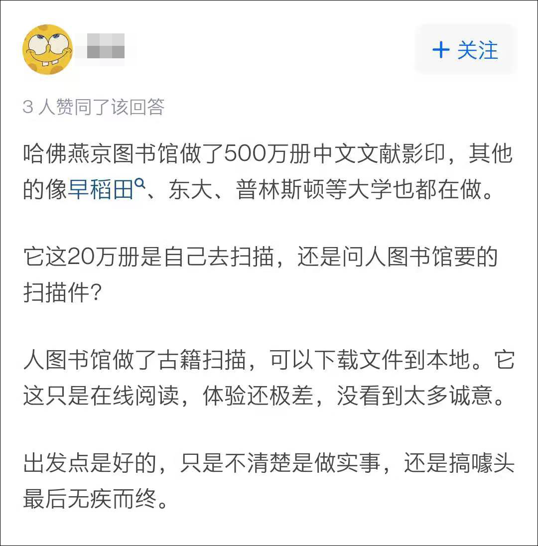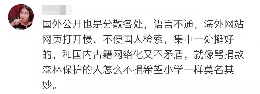 隨即有網友反駁道:“沒有針對普通讀者的配套導引,也沒大意義,重點不在所謂的海外古籍網絡迴歸,而在於用户體驗。”