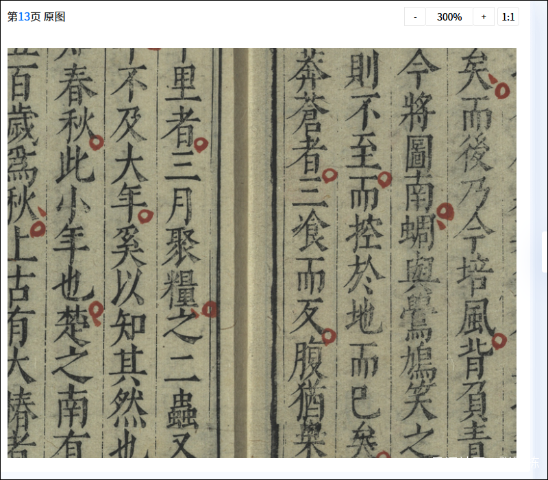 古籍《莊子通》放大3倍後 的《逍遙遊》片段 截圖自“漢典重光”古籍數字化平台