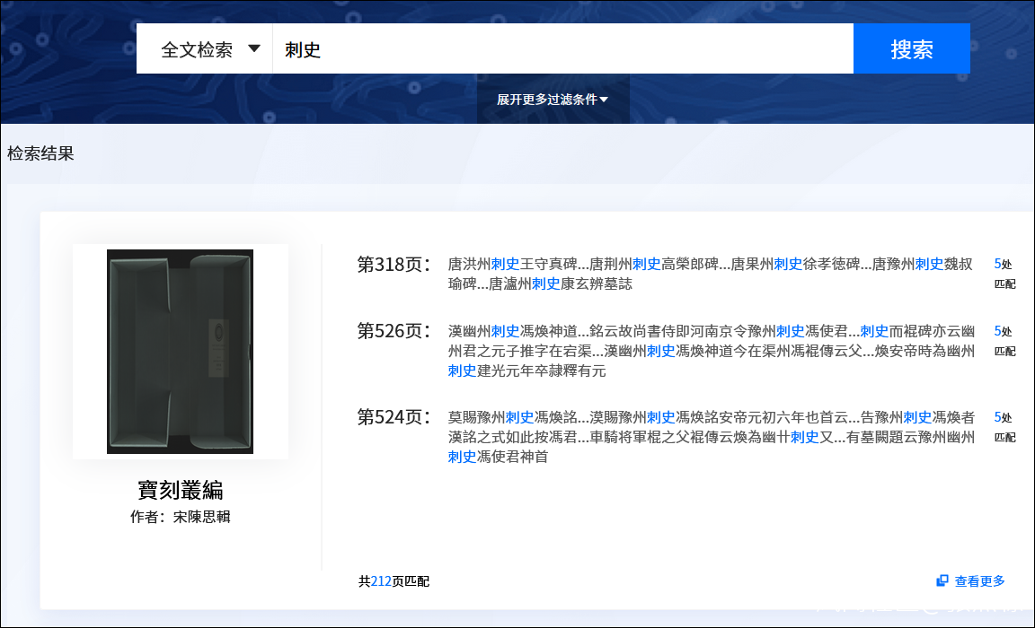 筆者登錄“漢典重光”古籍數字化平台,在檢索欄輸入最近引發討論的“刺史”二字,該平台所收錄的古籍中,所有出現“刺史”二字的書籍一一呈現,並且精確到具體頁面。