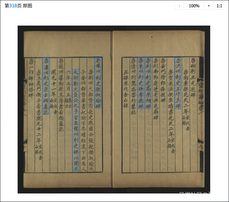點擊搜索結果,就會進入相應的古籍頁面,而出現“刺史”二字的地方,也會用半透明藍框標出。