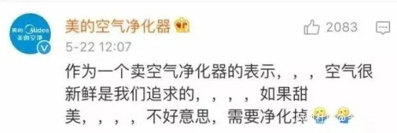 “作為一個賣空氣淨化器的表示,空氣很新鮮是我們追求的,如果甜美,不好意思,需要淨化掉。”