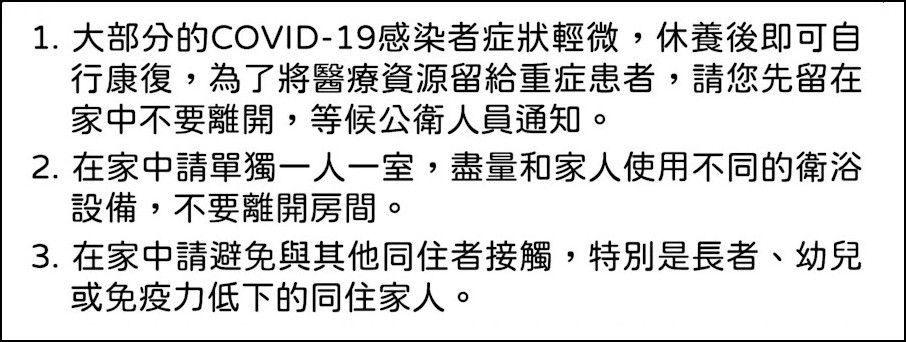 近日公開的台灣疫情指揮中心防疫指南中宣稱,大部分新冠肺炎患者的症狀都很輕微,在家休養基本可以自行康復,所以輕症患者在家等待疫調人員即可,要把醫療資源留給重症患者。而居家隔離的要求是,遵守1人1室、避免使用同一衞浴間、避免接觸家人等。