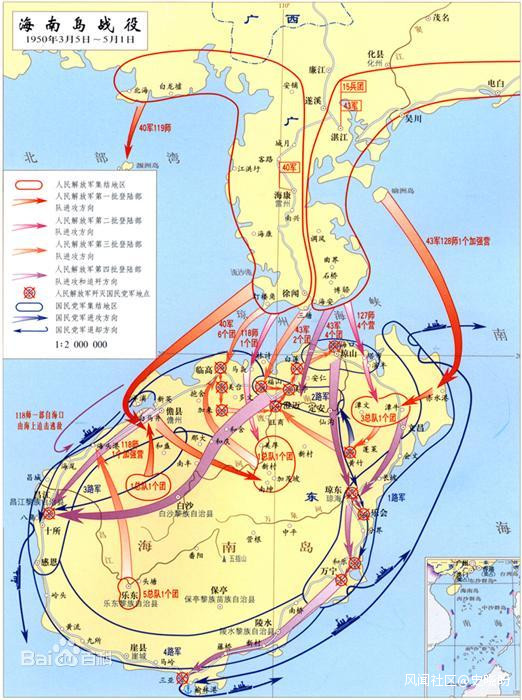 海南之戰原來是一個小規模的戰役,四野渡江之後,真的是虎狼之師,本來李代總統德鄰和白上將健生都幻想在蔣中正跑到台灣後,他們可以憑藉桂系軍隊一逞悍勇,保住一點地盤的。但想不到被四野大軍和陳賡的四兵團一衝擊,尤其在衡寶戰役之後,被打斷了脊樑骨,此後,對於李白兩位的念想,就是能逃出多少隊伍的問題了。但可惜的是,雖然李白經營了桂系隊伍數十年,但還是逃不過解放軍的大穿插,大包圍,所以後來,連國民黨臨時政府的所在,廣州都是沒有經過一次戰鬥就被解放了。-------因此,本來對解放海南,只打算用43軍(時任軍長李作鵬開國中將),也就是前東野六縱,來解決問題的。-----但未想到1949年10月,三野攻擊距離大陸幾公里之間的金門島失利,全軍覆沒。所以,林總改變決心,把原定43軍一個軍解決海南的計劃改為,43軍和40軍一起進攻。當時的部署是第15兵團負責整個廣東地區軍事(海南島這時不是後來的海南省,而是屬於廣東省管轄),所以,韓先楚的40軍在此戰中應該算是客軍。----不過,在此後的戰役進程裏,40軍的確發揮了更大的作用,而這是有客觀原因的。