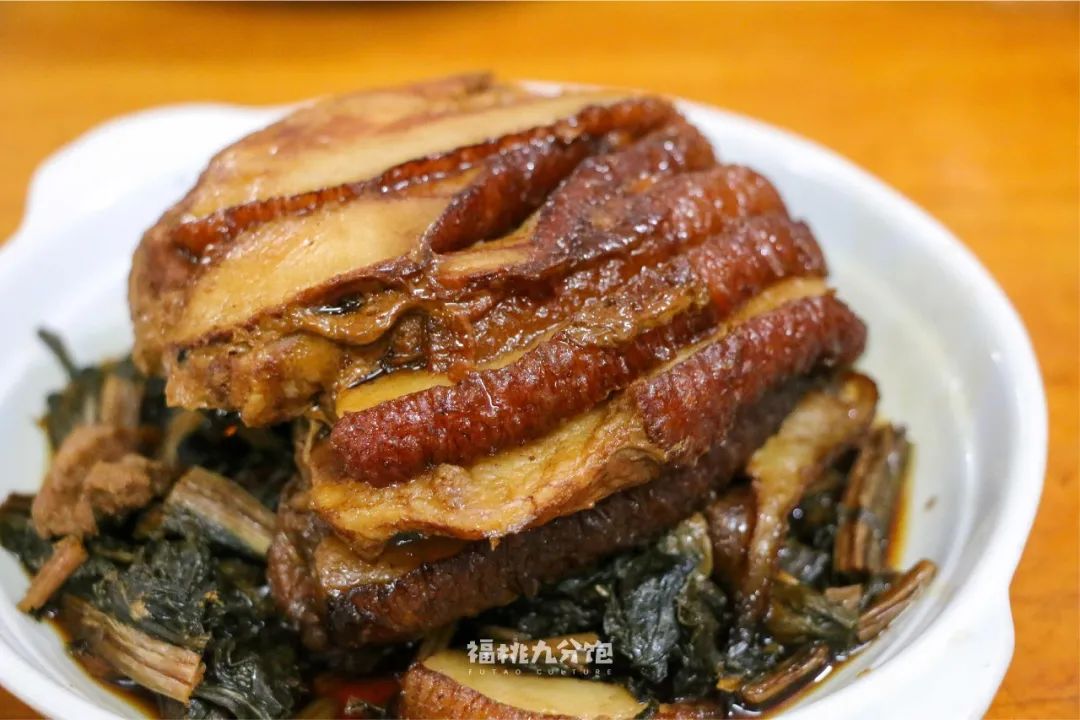 農家飼養的豬肉做原料,做出的梅菜扣肉油膩豐腴了許多,但是雖味重顏色深,但下飯配酒才是重點。
