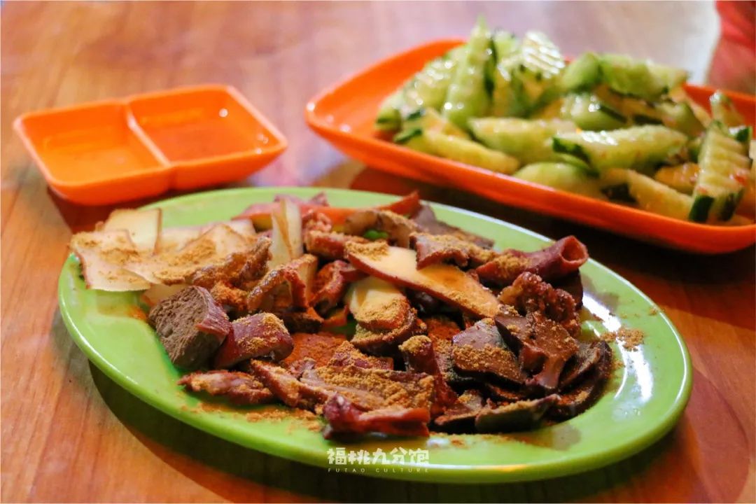 除了上面的食物,梅州街頭還有許多小食等着你去探索,比如老樓下的金山牛雜,撒上了梅粉,蘸上特有的辣椒醬,坐在店旁邊的位子上,吹晚風喝啤酒,是梅州獨有的温柔。