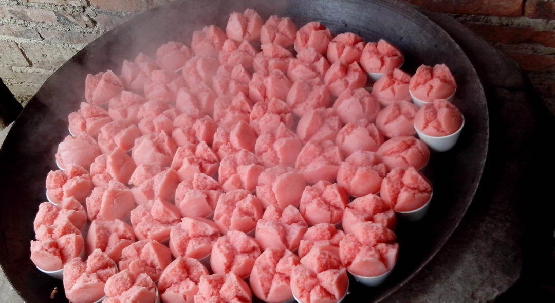 街頭紅彤彤賣着的叫**“發粄”,又叫“富粄”“碗粄”,經過發酵,粄面從碗裏隆起來,像一座出現裂縫的小山峯,**準備紅事時一定要有,吃起來甜得清新軟綿。