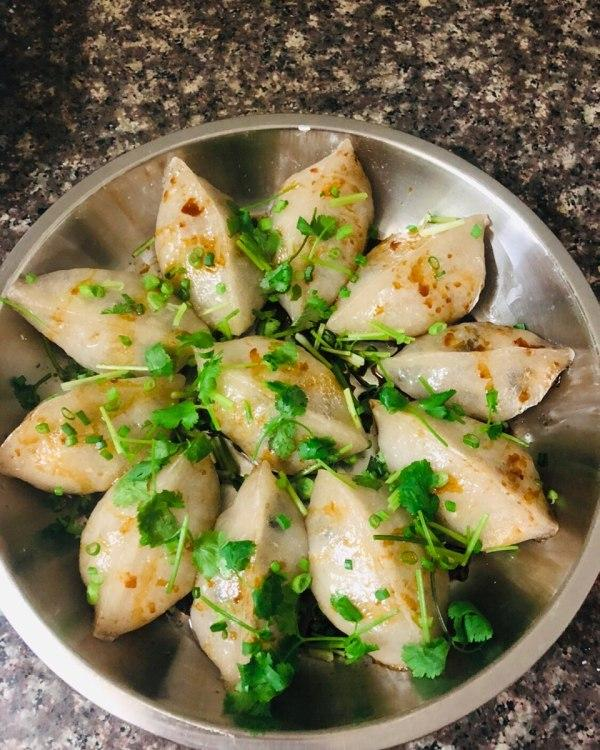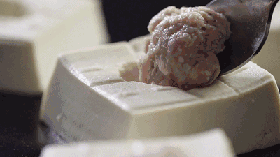 最初是釀豆腐,豆腐上按出一個洞,讓後把調好的肉餡放進去,煎後掛汁,豆腐軟嫩,吸足了肉汁,吃一口是肉香和豆腐香兩者交替融合,欲罷不能。