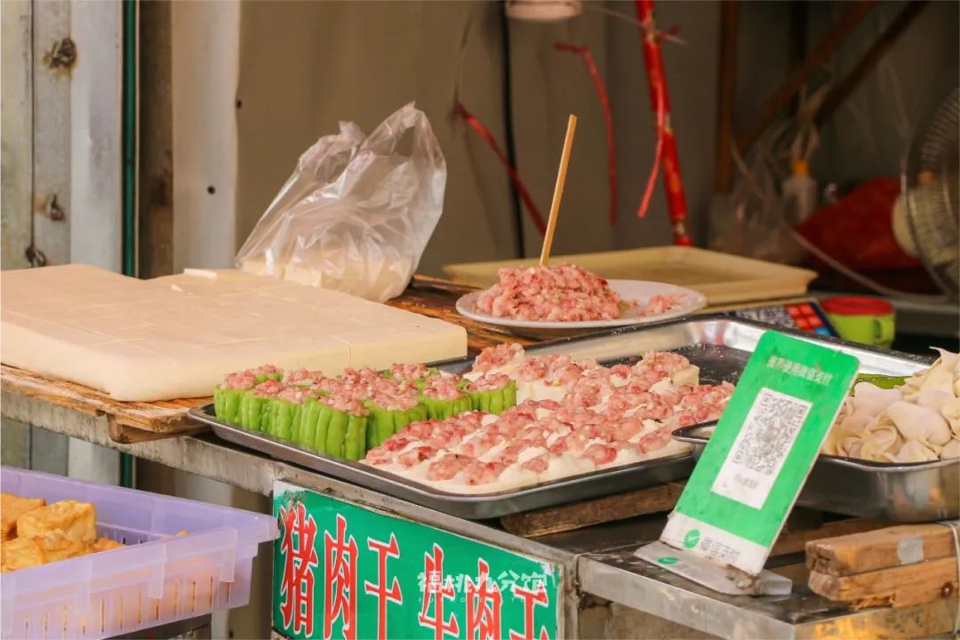 除了豆腐可以釀,**辣椒苦瓜茄子雞蛋田螺柚子皮都可以做成釀菜,餡料也不僅僅只是豬肉餡,豬肉牛肉螺肉,菜頭冬筍紫蘇,**就像中原的餃子一樣,可以隨意變換。