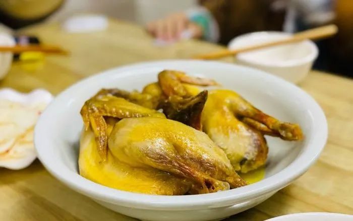 比如鹽焗雞,就是南遷過程中為保存食物的妙手偶得,雞放入鹽包中保存,醃製過後,再拿出用紙包好,放入盛有炒熱鹽的砂煲中煨熟。