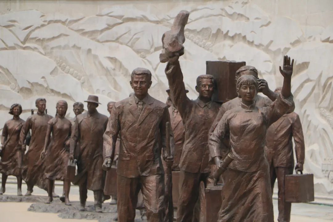 這組雕塑正是反映當時青年們到達延安的景象。他們裝束雖各異,有着西裝革履者,有着傳統長衫者,有手握書卷者,也有揹負樂器者,但臉上露出的喜悦和眼神裏的堅定是一致的。