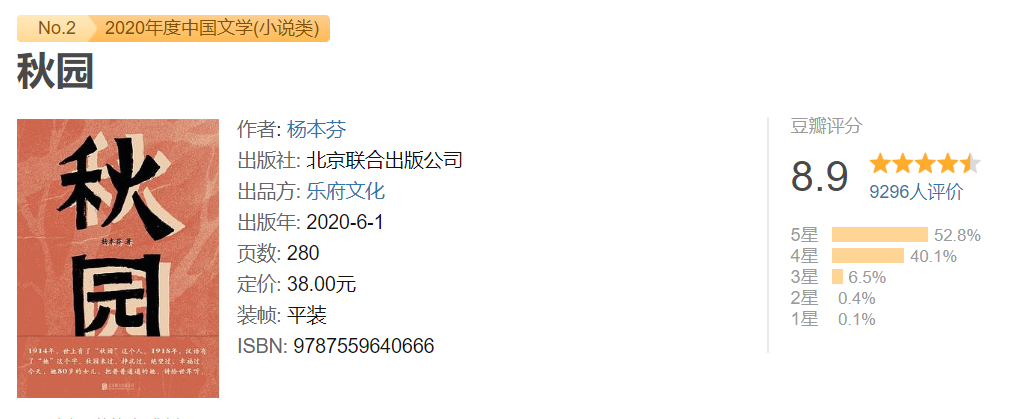 《秋園》在2020年度中國文學小説類榜單中排名第二,豆瓣評分高達8.9。讀過的人雖然極少,但讀者評分卻極高。