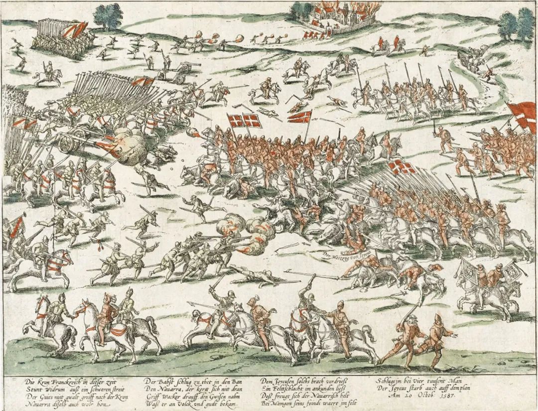 因此,重裝騎兵的“樹籬”隊形會以逐步加速發起衝擊。部隊先以相當慢的速度展開機動,然後在保持隊形的同時提速前進(理想狀況下)。按照耶穌會士加布裏埃爾·丹尼爾的看法,重裝騎兵通常只在最後60步(約40米)才展開跑步衝擊,之前很少使用跑步。富爾克沃的説法就更極端了,他聲稱只讓自己的重裝騎兵在距離敵軍20-30步(約12-20米)時投入跑步。上述觀點已經與後來18世紀歐洲騎兵的常用戰術頗為類似。不過,也不是所有人在激烈的戰鬥中都能遵循這種原則,後來在法國宗教戰爭期間,1587年進行的庫特拉會戰(bataille de Coutras)就提供了一個非常有啓發性的戰例。天主教方面的重裝騎兵全速奔馳了400步(約250米),這個距離實在是太長了,它不僅過早地消耗了馬力,還破壞了部隊的嚴整隊形。於是,“從遠處跑過來之後,最渴求光榮的人讓他們的坐騎跑在前面,最謹慎的人落在後面,所有人都以襲步跑得太久,並沒有用騎槍打出應有的效果。”
