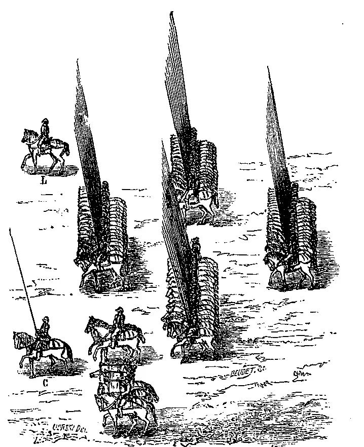 於是,每個“蘭斯”中的士兵就這樣分組作戰,他們在戰鬥中採用的正是從中世紀傳承下來的樹籬隊形。根據人數和地形,敕令騎兵連的重裝騎兵們會展開成一個或多個樹籬橫隊。各個“樹籬”內部儘量把來自同一個連隊的騎兵安排在一起,以使得部隊儘可能容易地保持嚴整隊形。