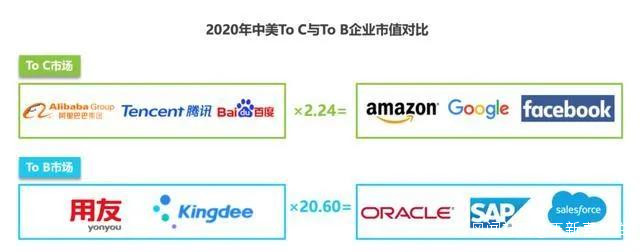 根據2020年4月艾瑞諮詢發佈的《2020年中國企業服務研究報告》,儘管中國C端互聯網的體量與美國對應企業已頗為接近,但在B端,中國與美國企業的體量仍有較大差距,這也意味着巨大的增長潛力。