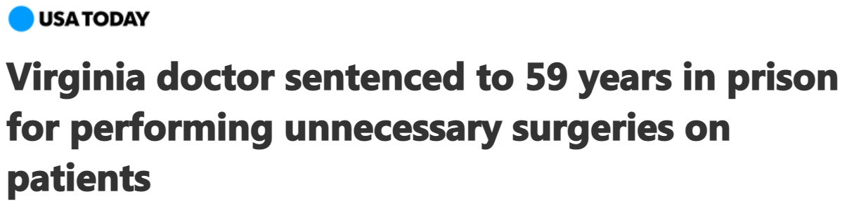 《今日美國》:根據美國司法部的説法,弗吉尼亞州的一名醫生因對其患者進行了不可逆的子宮切除術,不適當的絕育手術以及其他醫療上不必要的手術,被判處59年監禁。