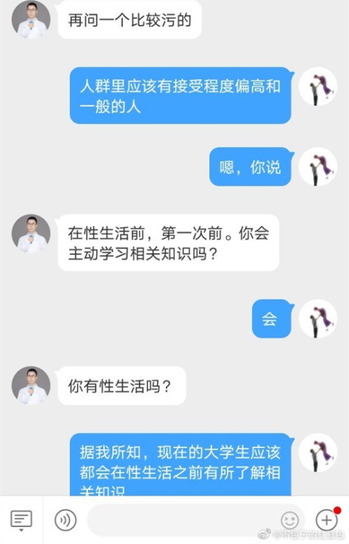 截圖顯示,@皮膚科醫生林小清 賬號從性病科普調查問到私密的性行為細節,不時出現露骨言論,期間@不包子的紅豆包 曾反問“問題的走向是不是有點奇怪了?”對方答“沒有沒有”。
