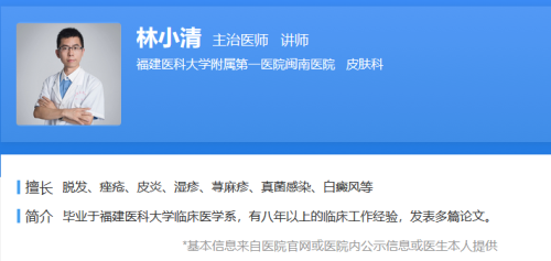 某線上問診平台顯示,林小清畢業於福建醫科大學臨牀醫學系,現為福建醫科大學附屬第一醫院閩南醫院皮膚科主治醫師,擅長脱髮、痤瘡、皮炎、濕疹、蕁麻疹、真菌感染、白癜風等疾病。