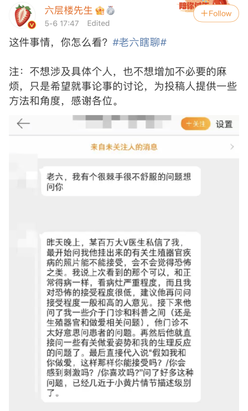 @六層樓先生 隨後曬出匿名投稿,在其並未透露涉事博主姓名的情況下,評論區一些網友懷疑涉事醫生為@皮膚科醫生林小清。