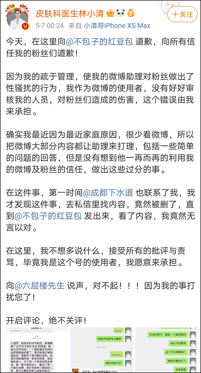 事件引發關注後,@皮膚科醫生林小清 7日凌晨道歉稱:“因為我的疏於管理,使我的微博助理對粉絲做出了性騷擾的行為,我作為微博的使用者,沒有好好審核我的人員,對粉絲們造成的傷害,這個錯誤由我來承擔。”
