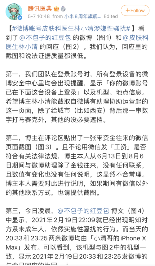 @騰訊醫典 指出,希望林小清能截取自微博有助理協助運營起的這一頁面,並展示機型和地點信息;所謂“工資單”截圖顯示,博主本人從6月13日到8月6日期間與微博助理除了金錢往來,沒有任何聯繫,且數值有變化也沒有任何説明,這顯然不合常理;博主今年2月就已經出現明知網友系未成年人依然實施性騷擾的行為,且當天兩條微博均由“小清哥的iPhone X Max”發佈,與5月7日回應的為同一人。