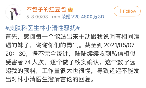 8日凌晨,@不包子的紅豆包 反映稱,截至5月7日20時30分,她已陸續收到累計74人次的受害者私信,並逐個做了核實確認,被@皮膚科醫生林小清 賬號“性騷擾”的對象從17歲在讀高中生到兩個孩子的媽媽都有。