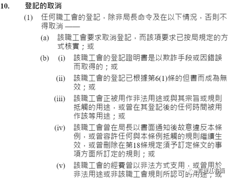 然而“職工盟”將工會納入其屬會就發生了本質性的改變。這樣,職工盟作為大台,工會能以“職工盟”屬會的身份為掩護參與論政,甚至堂而皇之地組織明顯帶有政治意圖的亂港活動,至於經費的使用,則可能由“職工盟”代為支付,也不排除為了方便工會自行支付相關經費再去找“職工盟”報銷的情況,那麼這些工會就極有可能存在違反《職工會條例》的情況,可取消其登記。