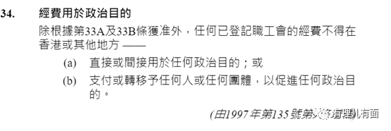 《職工會條例》規定工會本身不能將經費直接或間接用於政治目的、支付或轉移予任何人或任何團體以促進任何政治目的,條例規定的初衷是禁止職工會參與政治活動的。例如組織帶有政治意圖的活動、製作表達政治見解的橫幅,這些都是被禁止的。