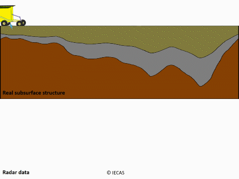 次表層雷達主要原理是不同物質的介電常數(可以簡單理解為讓電磁波衰減的能力)不同,因此探測器收到的從不同物質分界面反射回來的電磁波的時間和強度就會不同。那麼反過來,通過測量到的雷達接收時間和反射強度,就可以反推這些雷達信號穿過了哪些不同的物質,每層物質有多厚。