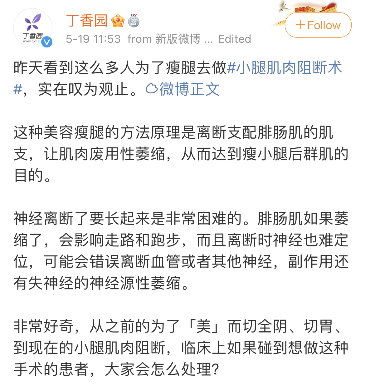 5月19日,醫療科普大V@丁香園 發文稱,這種美容瘦腿的方法原理是離斷支配腓腸肌的肌支,讓肌肉廢用性萎縮,從而達到瘦小腿後羣肌的目的。