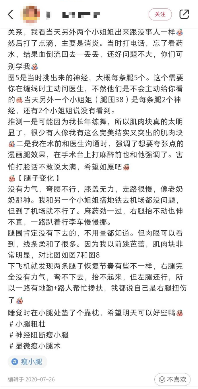 其中一名網友在2020年7月發佈的分享帖中,稱自己因為常年練舞,腿部有結實又突出的肌肉塊,所以術前和醫生溝通時,強調自己想要“誇張點的漫畫腿”效果,手術時每條腿被挑出來5個神經。