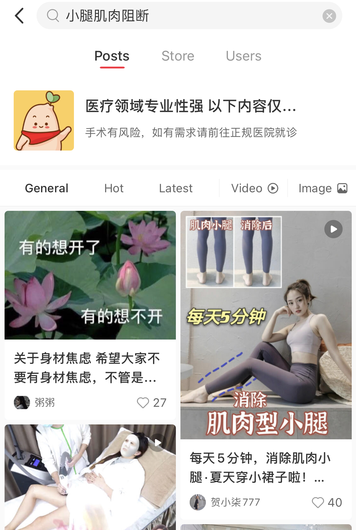 20日下午,觀察者網發現,在此前能搜到多篇“小腿肌肉阻斷”經驗帖的小紅書,搜索該內容時出現了“醫療領域專業性強,以下內容僅供參考”的提示,且推薦內容已被替換為“瘦腿操”等非手術內容。
